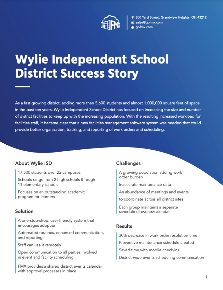 Wylie Independent School District decided to enhance its facilities management software with FMX. Finding FMX user-friendly and feature-rich, staff quickly adopted the software once staff discovered they could see pending and completed work orders from their mobile devices while on work sites. It sped up the work resolution process while keeping maintenance schedule requests all together in one system, making data recall fast, accurate, and accessible.