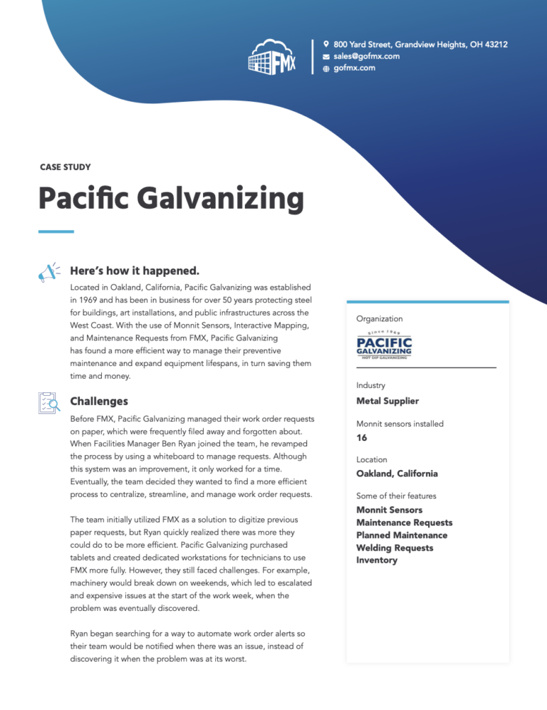 Located in Oakland, California, Pacific Galvanizing was established in 1969 and has been in business for over 50 years protecting steel for buildings, art installations, and public infrastructures across the West Coast. With the use of Monnit Sensors, Interactive Mapping, and Maintenance Requests from FMX, Pacific Galvanizing has found a more efficient way to manage their preventive maintenance and expand equipment lifespans, in turn saving them time and money.