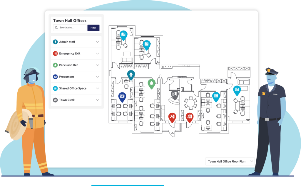 - Pinned locations in critical areas like exit doors, assembly points, security cameras, fire extinguishers, emergency shut-offs, and hazardous materials locations
