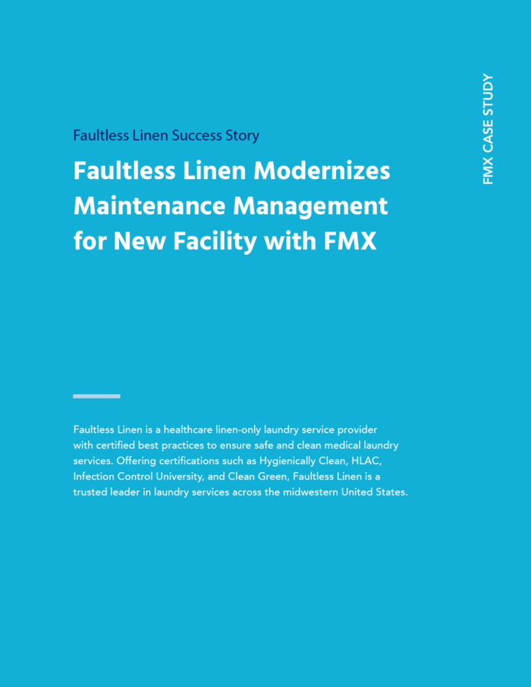 Since implementing FMX, Faultless Linen staff can now work anywhere, anytime, and on any device using an intuitive interface. Work orders, preventive maintenance, inventory management, and reporting is centralized into a single solution to enable a proactive approach. This has allowed the organization to fully automate all preventive maintenance needs, including time-based and meter-based maintenance processes, with alerts and notifications. At-a-glance, managers can now view reports and dashboards on every aspect of their maintenance processes. Internal teams can also ensure they have the right parts and supplies any time they need them with more comprehensive inventory control (e.g. barcodes and QR codes). All of their departments are also able to successfully and easily submit work orders and track the progress and completion of those work orders. The cloud-based solution fully connects the organization and enables each department to align on the right priorities, follow-up actions, coaching opportunities, and more.